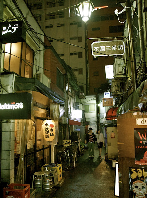 Welcome to the infamous Golden Gai, the little giant in Shinjuku's huge night entertainment sphere, a prostitution area prior to 1958 before it became illegal. It's made up of a network of six narrow alleys connected by even narrower lanes wide enough for a single person to pass. Believe it or not, there are two hundred "old-style" Japanese bars, jazz bars, R&B bars, karaoke bars, chanson bars, ramen shops, soba shops and yakitori bars squeezed in six narrow passages making it famous both as a night spot and as an architectural interest.